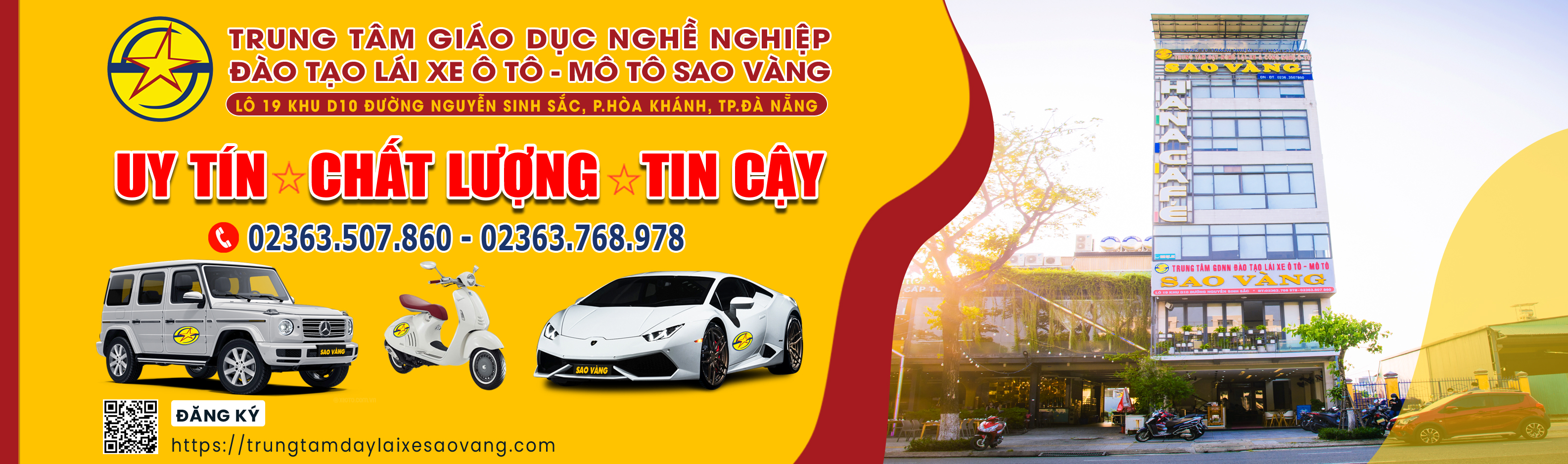 Lời đầu tiên, cho phép chúng tôi gửi tới quý khách những lời chúc an lành và tốt đẹp nhất. Là một trong những doanh nghiệp lớn tại thành phố Đà Nẵng, hoạt động chuyên về lĩnh vực đào tạo thi lấy GPLX hạng A1, B (tự động và cơ khí). Sau nhiều năm hoạt động và được sự ủng hộ của quý học viên, Trung tâm Giáo dục nghề nghiệp đào tạo lái xe ô tô – mô tô Sao Vàng chúng tôi đã không ngừng nổ lực nâng cao chất lượng đào tạo tất cả với mục tiêu “Vì quyền lợi học tập của quý học viên”.